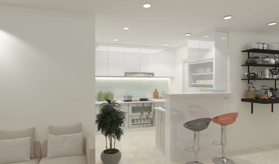 tủ bếp chữ I màu trắng giúp phòng bếp thông thoáng hơn​