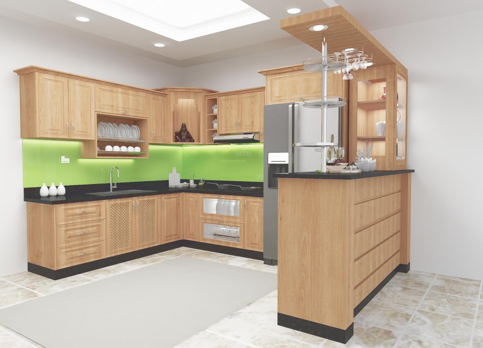 tủ bếp chữ L gỗ xoan đào tự nhiên sang trọng